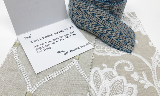 • Leave behind swatches of fabric your client ordered. You can order extra swatches from Carole Fabrics!