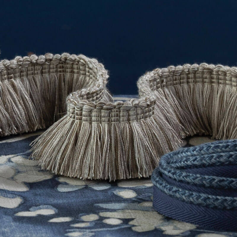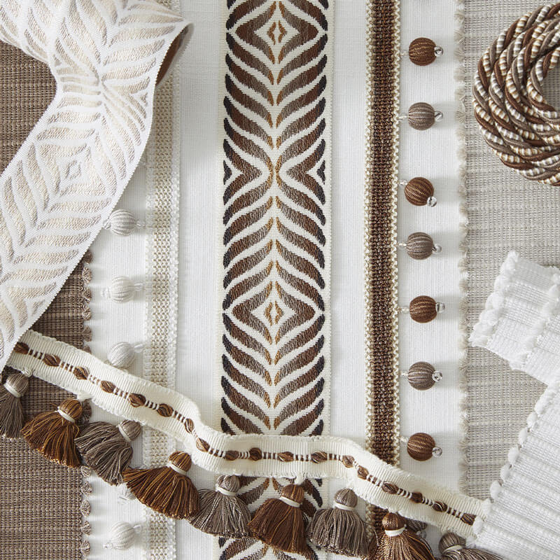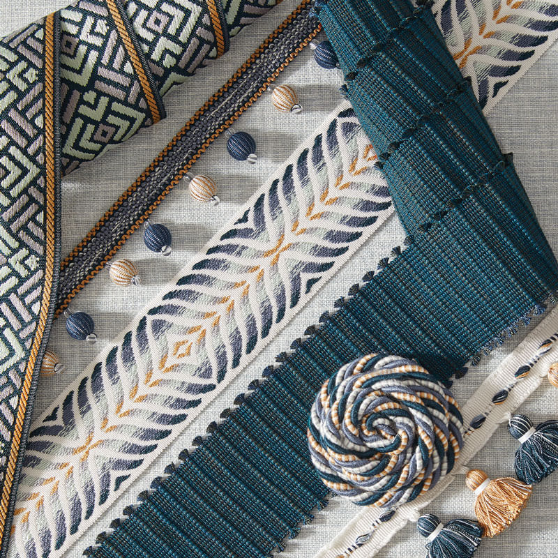 Springfeld Trimmings is an exquisite collection that features more than 50 trims in four styles and 14 colorways. Multicolor tonal yarns add dimension and versatility to tape with a subtle woven edge, braided mini lip cord, lavish brush fringe, and luxurious tassel fringe.